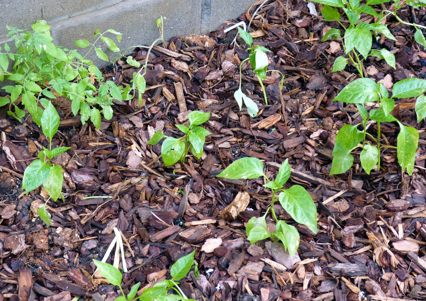 GardenPlantsSince I was planting full size plants and not direct-sowing seeds, I went ahead and added mulch around the plants. Mulch really helps new seedlings retain moisture since they don’t have deep, established roots yet. The chunky pine mulch also helped some of my floppy plants stand up a bit straighter until their stems strengthen enough to support themselves. I skipped the mulch over the areas where we put just seed, to make sure the new seedlings are able to get enough light and heat to germinate. Once the plants are up and established, I’ll weed around them and add mulch then.