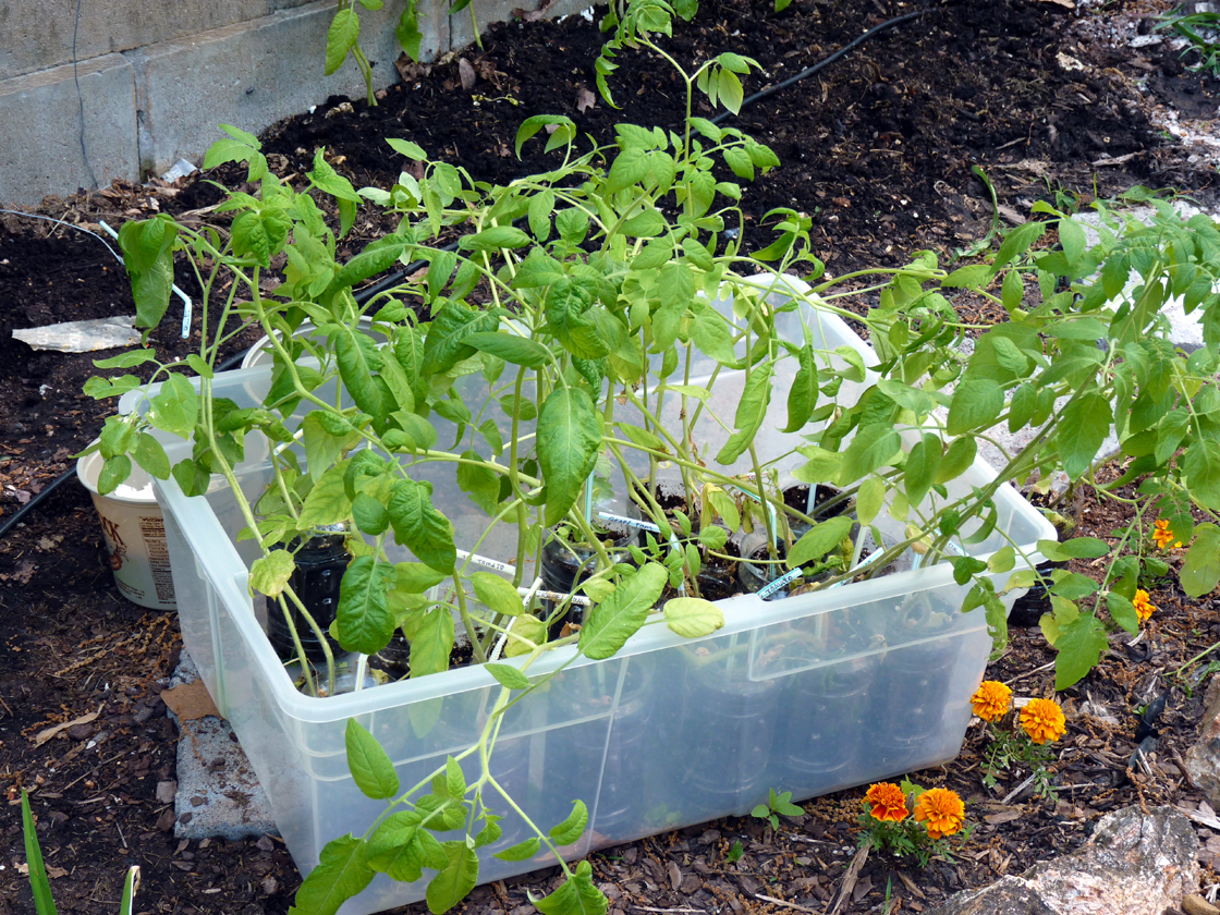 These were the plants that I started from seed back in February or March. In the past couple weeks, when it FINALLY stopped snowing here and the night temperatures were above 50F, I began the process of hardening off the plants. Pepper plants shouldn’t be transplanted to the ground until the earth has warmed to at least 50F; to do so earlier could kill them or hinder their growth until warmer weather comes. Tomato plants are a bit more forgiving, but you have to cover or shelter them if there is any danger of frost.