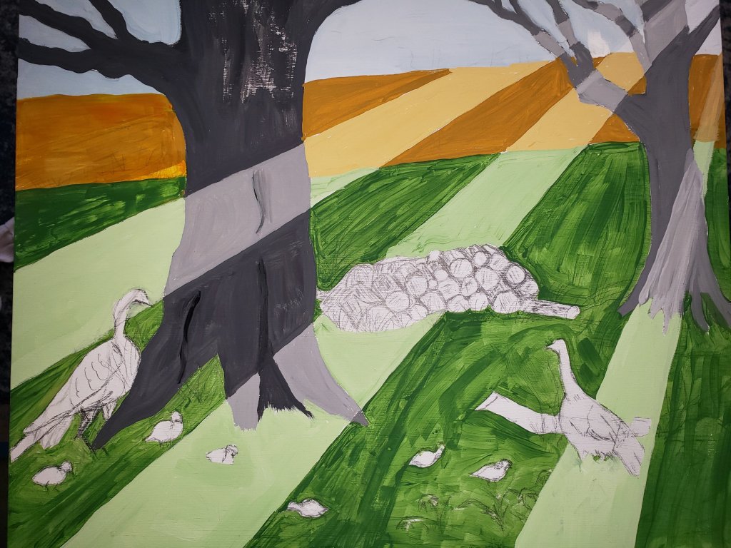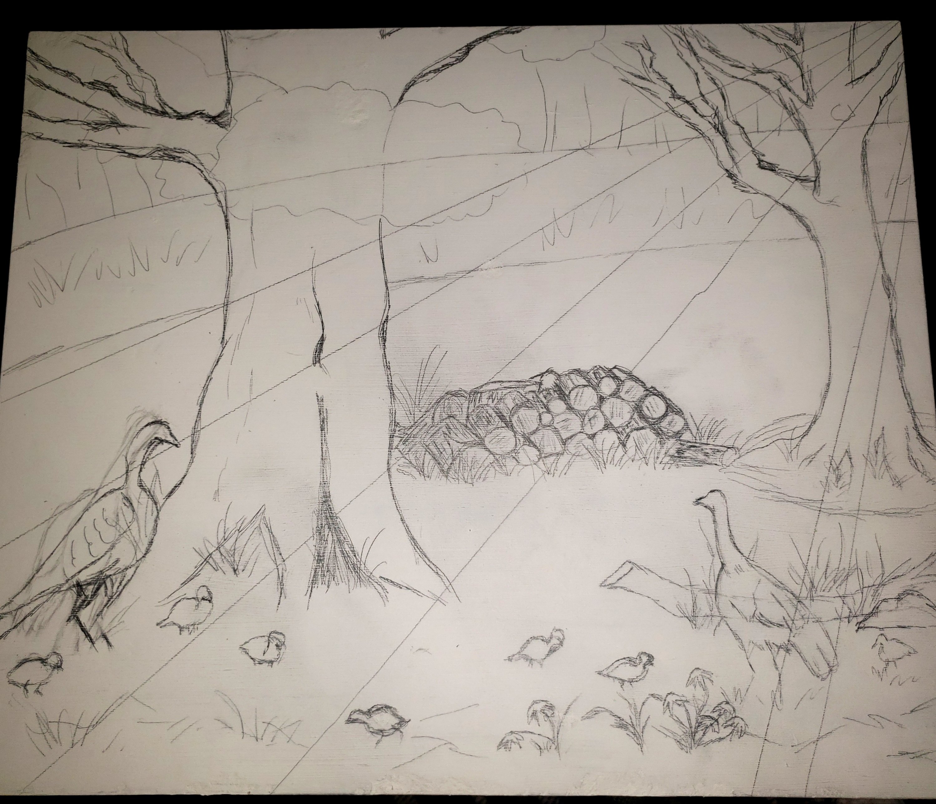 Above is the original sketch for the scene in pencil. I don’t go into a lot of detail because I’m just going to paint over it anyway. I usually do an even rougher version on paper first, because the primer on these tables is not especially easy to erase mistakes on. You can see where I decided I didn’t like the position of the left turkey and attempted to erase it. I decided f%#$ it, it’s easier just to paint over the old lines. I take pictures of all this so if I do paint over something and can’t tell what was there before, all I have to do is look at the photos from the last steps. The lines across the picture map out the direction of my light source. I’m going to attempt putting in streaks of light in this one.