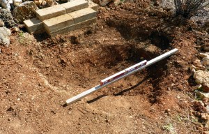 My first step was covering the door in dark blue paper as a backdrop. I then brought in foam insulation sheets that I’d picked up at Lowes ($7 for a pack of 5 I think) and dry-fit them to the wall to figure out where my blocks were going to go. The foam is only about 3/4 of an inch thick, so it scores and breaks fairly easily and is super light to work with.
