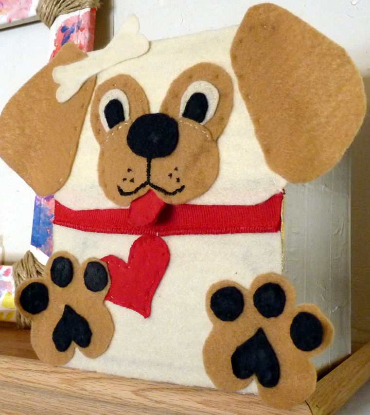 The penguin was done exactly the same way, except I used a foam panel and cut him out with the X-acto knife and then covered him in cloth. His eye, beak and feet are just acrylic painted poster board, hot glued to the material.