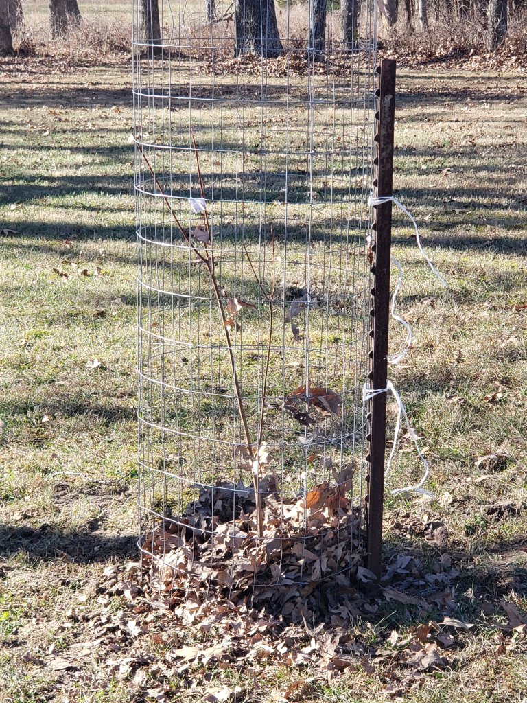 If you don’t have mulch on hand when you plant, chopped up leaves or straw work well. I’ve even used torn up cardboard. The trees I plant around our fields I throw an old tire on. It’s a good wind break and helps hold moisture around the roots. It also keeps me from running them over with the lawn tractor.