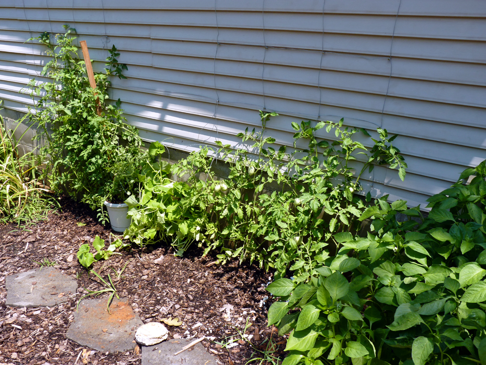 I’m building trellis straight up the side of the house out of just simple wire to support the vines. Nothing fancy and very inexpensive. I’m hoping the vines will pull double duty and absorb some of the heat that would otherwise be beating down on that southern exposure of the house. Due to our satellite TV and wireless internet, I can’t plant a tree there to block the afternoon sun. The veggies are going right into an old flower bed that was formerly full of nothing but tiger lily and butterfly bush. I had put off for years doing a vegetable garden, thinking I needed a formal space. They’re plants. They can grow in any garden bed and they don’t mind if they’re next to flowers. Silly me.