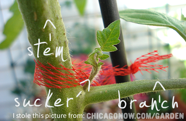 Non-fruiting suckers that develop in a crook between two stems can be removed to encourage development of the rest of the plant, especially toward fruit growth- which is kind of the whole purpose for planting tomato plants in the first place. Let the big leaves alone. (I started to write: “Leave the big leaves alone, but that sounded redundant) Removing too many leaves can let the sun burn your fruit, but a little pruning off the top and removal of suckers is helpful.tomato3