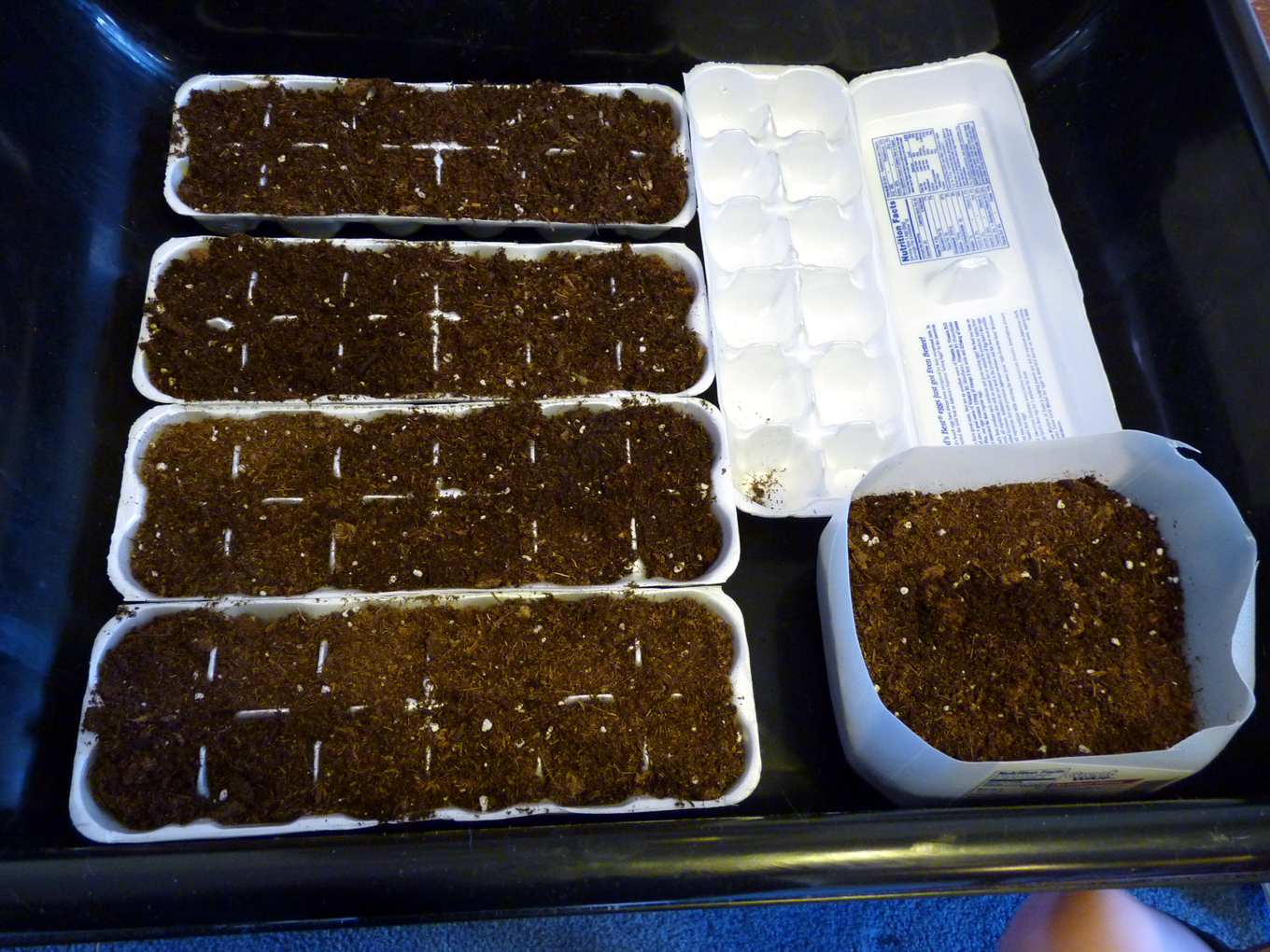 The reason for the big containers is to make it easy on you when it’s time to start the hardening off process. You’ll be moving your seedlings in and out of doors (unless you have a greenhouse or cold frame) and it’s much easier to carry large tubs than move 30 or more individual plants. Even using trays last year, I had some near deaths when plants decided to base-jump off the trays while I was walking.