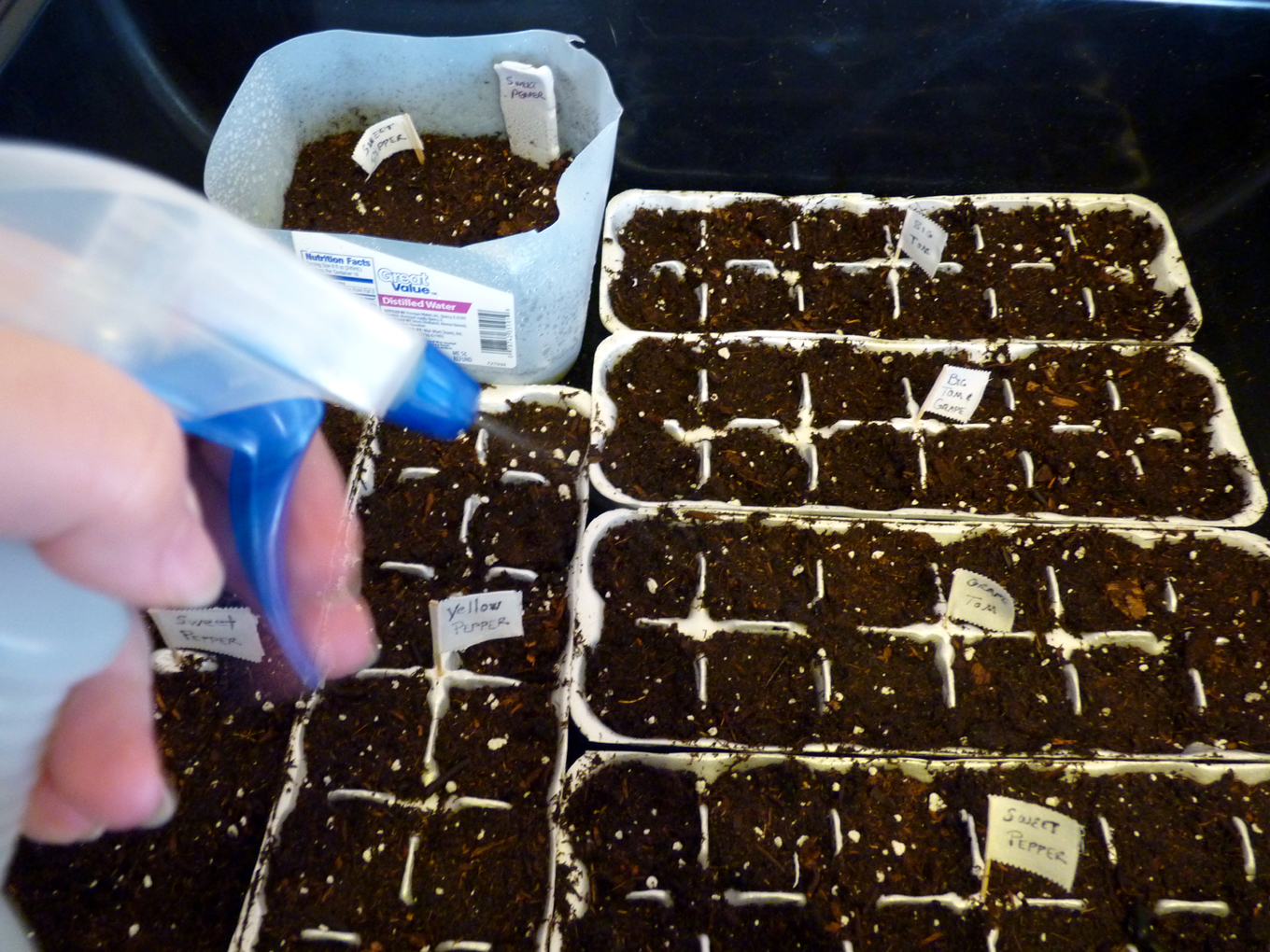 4) Once the seedling is planted in the bottle and labeled, you’ll want to give it a good drink. I use an old Tide liquid laundry soap bottle with a few holes poked in the cap. It works better than the huge water pitcher I use for my house plants, giving enough control to water the seedlings thoroughly without drowning them. If you’re concerned you’ll overwater, poke a couple drainage holes in the bottom of your bottles. Make sure to sit them on trays or in troughs if you do that though! I used the black garden trough that was the bottom of my greenhouse and commandeered a plastic crate from the closet; pepper plants went in one, tomatoes in the other. Segregating them keeps them out of trouble. For some reason, my tomato plants try to wrap themselves around other plants if they’re too close. They’re territorial little buggers.