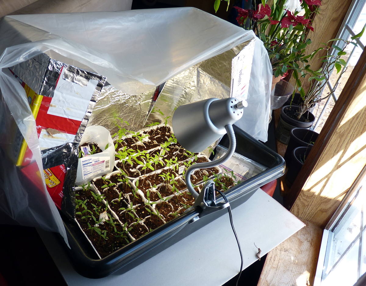 5) I removed the plastic cover over my ghetto greenhouse when I transplanted to bottles. They have plenty of soil around the roots now to hold water, they didn’t need the extra protection of plastic over them. Keeping the cover on will filter your light too, which can make them leggy. Even with the additional light source, my seedlings always seem to be slightly leggy plants. One thing I have found to help remedy this is to have the window open as much as possible so they get a breeze. I also put a fan on them sometimes, it makes them feel pretty when their hair blows in the breeze. Ok, in truth, I do this to make them stand up and grow a backbone- a slight breeze during the hardening off period, strengthens the plant’s stems. You don’t want wimpy plants that lie there and look pitiful when you move them out to the garden.
